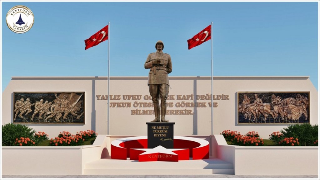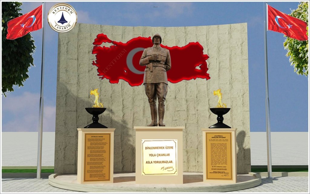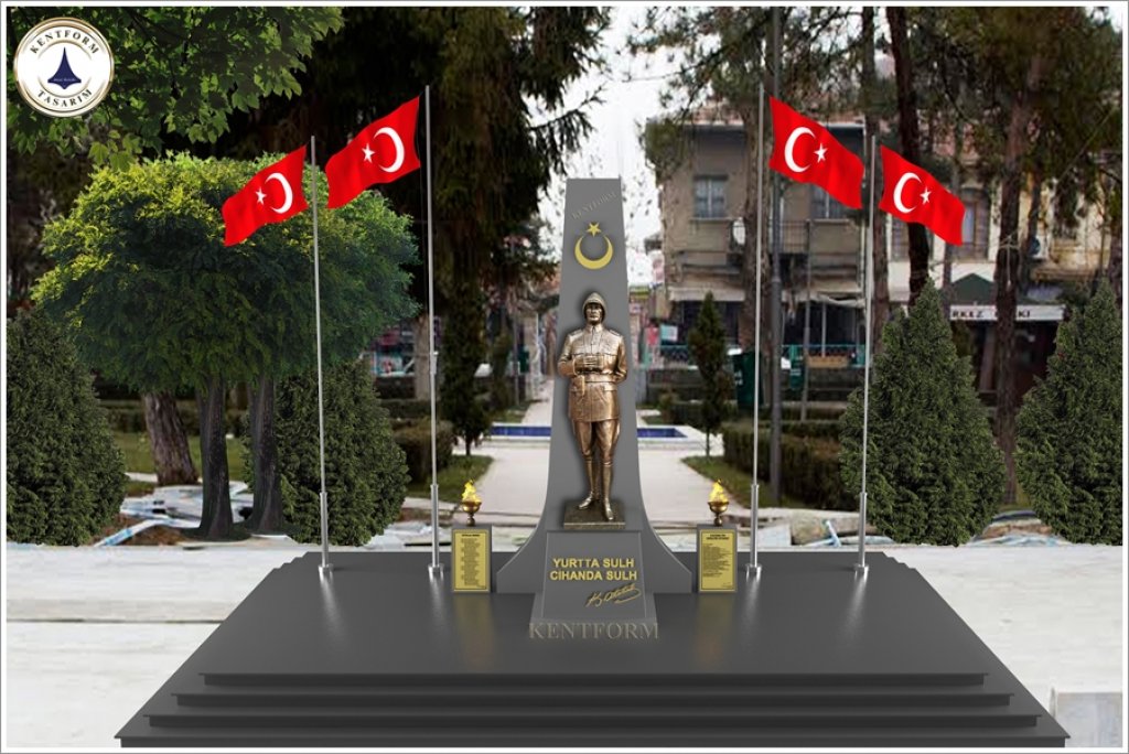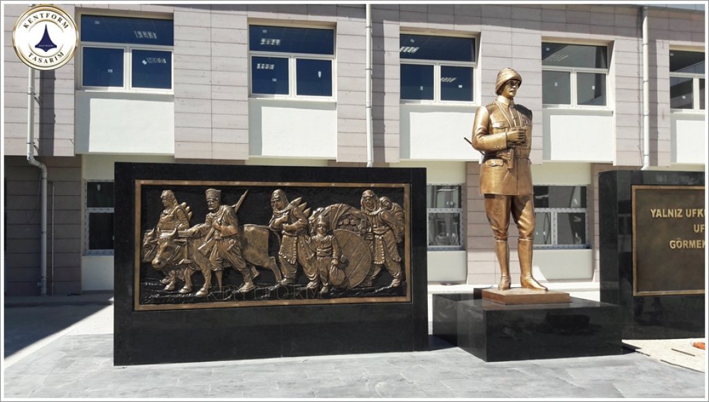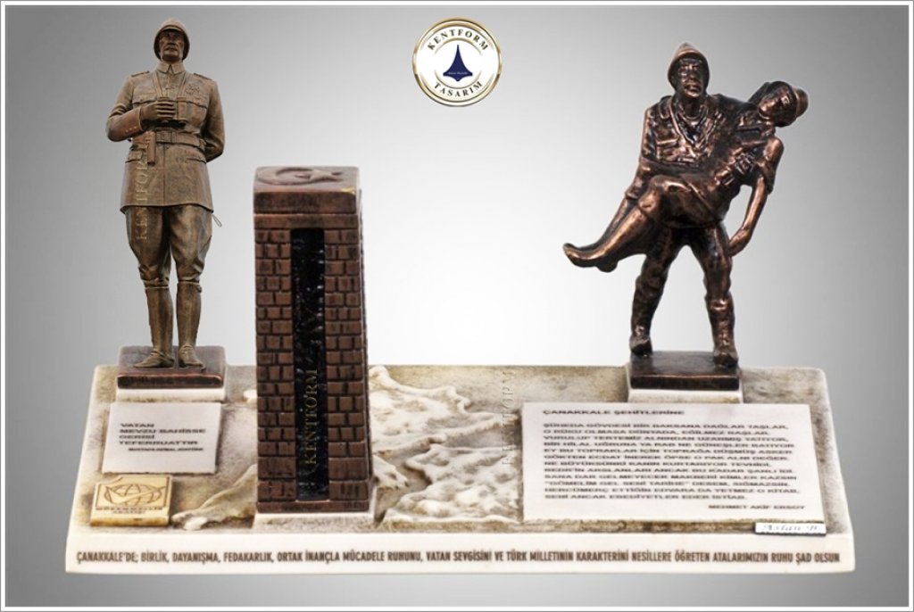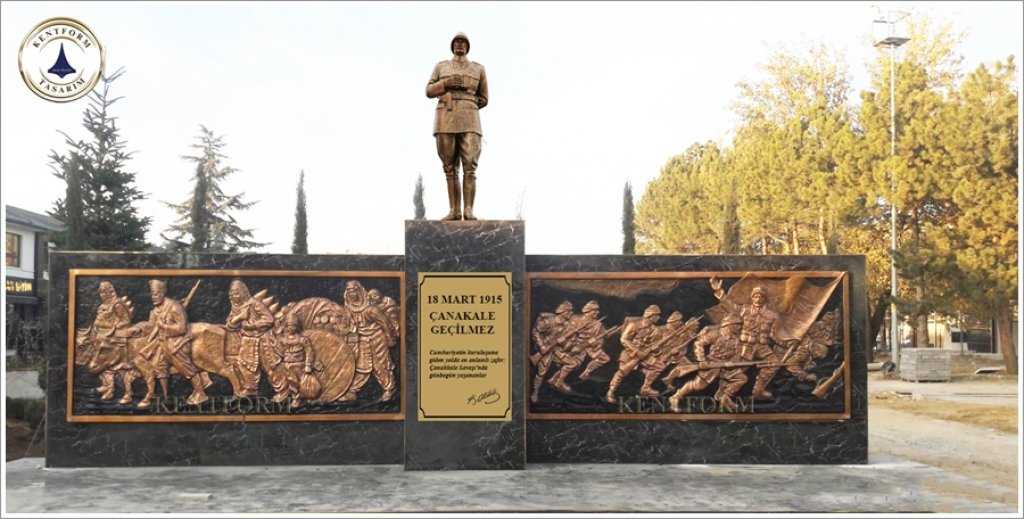 Atatürk Heykeli Tasarım Bilgisi: Mustafa Kemal Atatürk, Çonk Bayırı Anafartalar Grup Karargahındaki Çanakkale Savaşında kullanılan askeri üniformalı, çizmeli, başında şapkası, boynunda dürbünü, sağ eli dürbünü tutar vaziyette, sol eli arkada belinin üstünde kamçısını tutar vaziyette tasvir edilmiştir.Mustafa Kemal Atatürk Çanakkale Çonk Bayırındaki Çanakkale ruhu yansıtılmıştır.