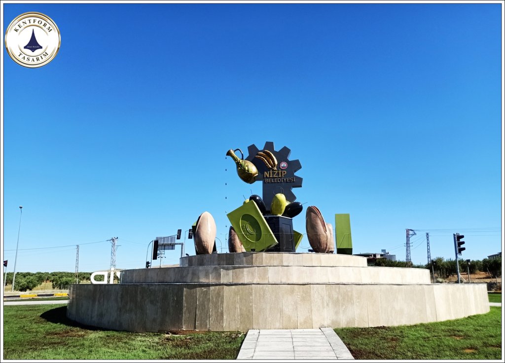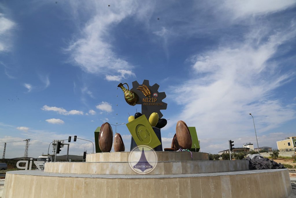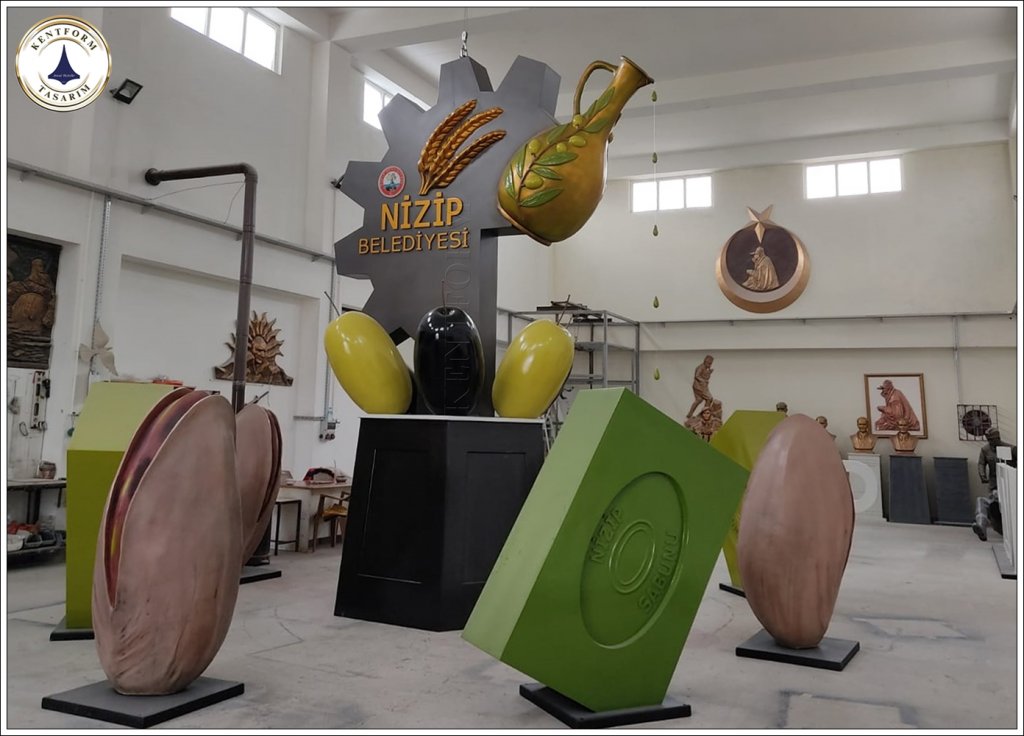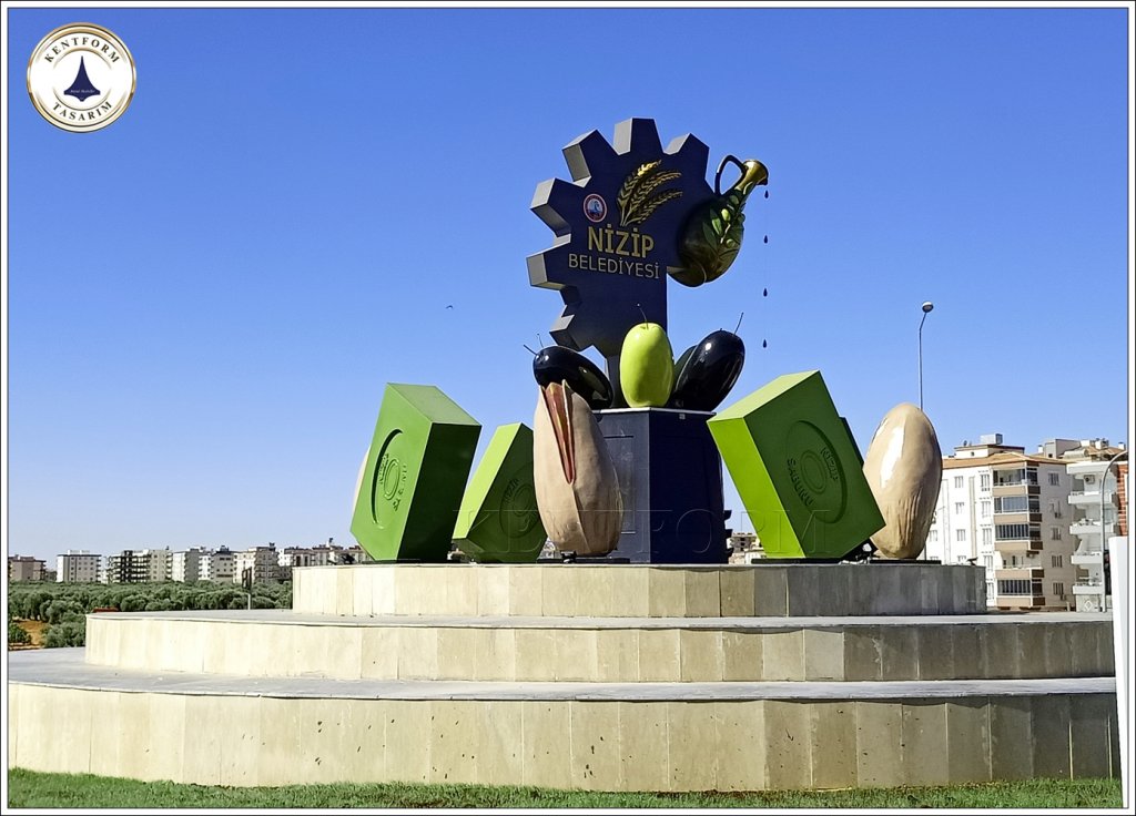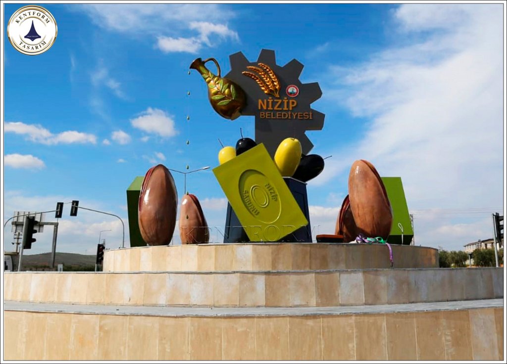 Nizip yöresel temalı şehir anıtında Nizip'in zeytini,fıstığı,Nizip sabunu ve Nizip zeytinyağı ürünleri ilçenin sanayisinin önemli unsurlarından dolayı sanayinin simgesi olan dişli çark ile tasarım bütünlüğü sağlanmış şehir anıtı formunda anıt ve heykellerin imalatları tamamlanmıştır.